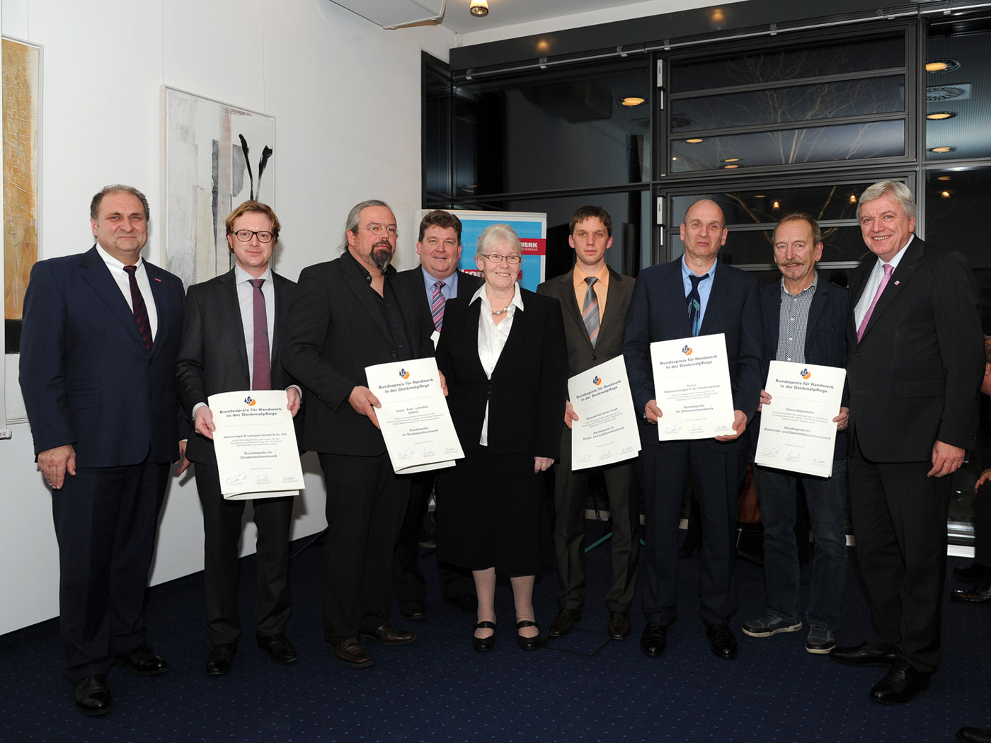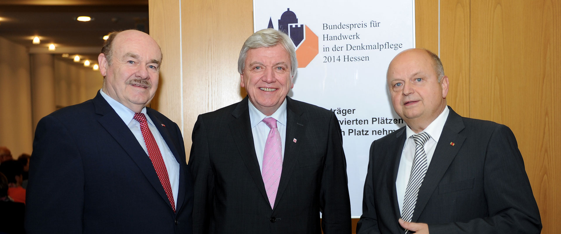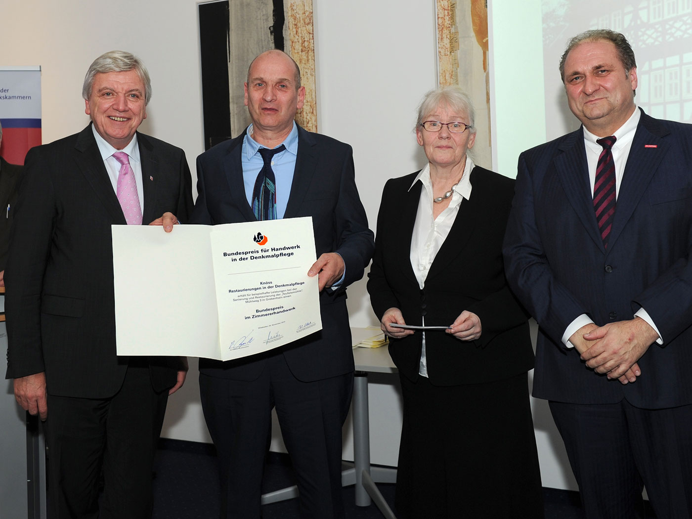 Am 25.11.2014 wurde uns bei einem feierlichen Festakt im Meistersaal der Handwerkskammer Wiesbaden der Bundespreis im Zimmererhandwerk verliehen. Der Ministerpräsident des Landes Hessen, Volker Bouffier, überreichte uns die Urkunde persönlich.