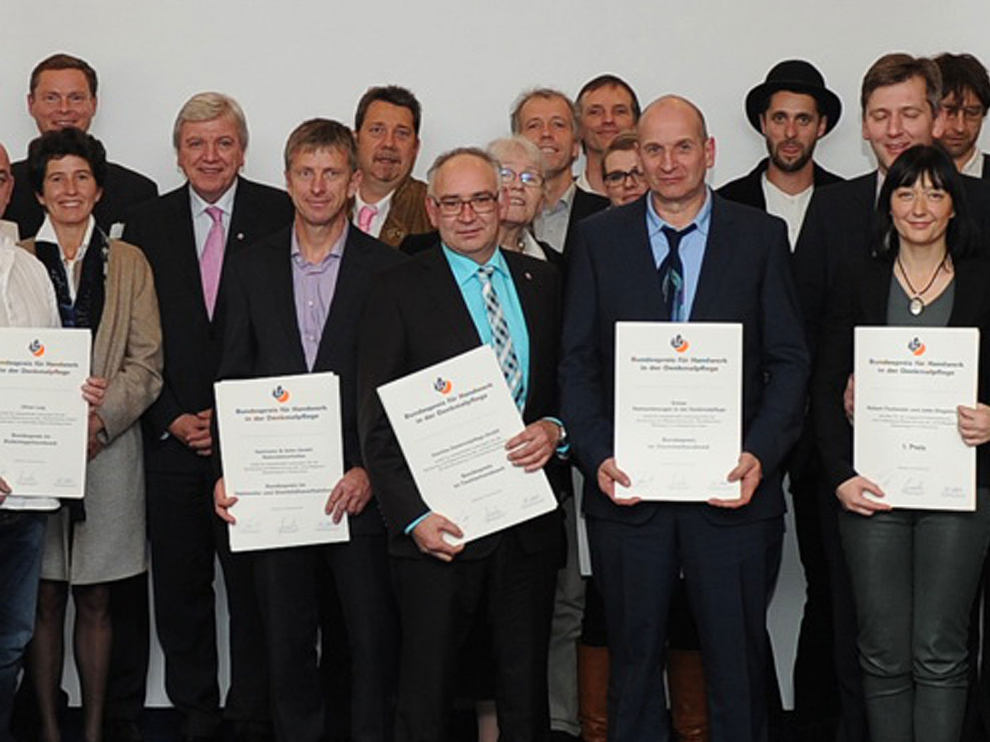 Ausgezeichnet wurden wir für beispielhafte Leistungen bei der Sanierung und Restaurierung der Teufelsmühle in Ilbeshausen. Für uns bedeutet die Auszeichnung die ehrenvolle Anerkennung für fast 30 Jahre ausschließliche Tätigkeit in der Restaurierung von historischen Holzkonstruktionen. Ebenfalls ausgezeichnet wurde Andre Lange aus Schrecksbach für beispielhafte Leistungen im Maler- und Lackiererhandwerk an der Teufelsmühle. Wir möchten ihn empfehlen für Putzer- und Malerarbeiten in der Denkmalpflege.
